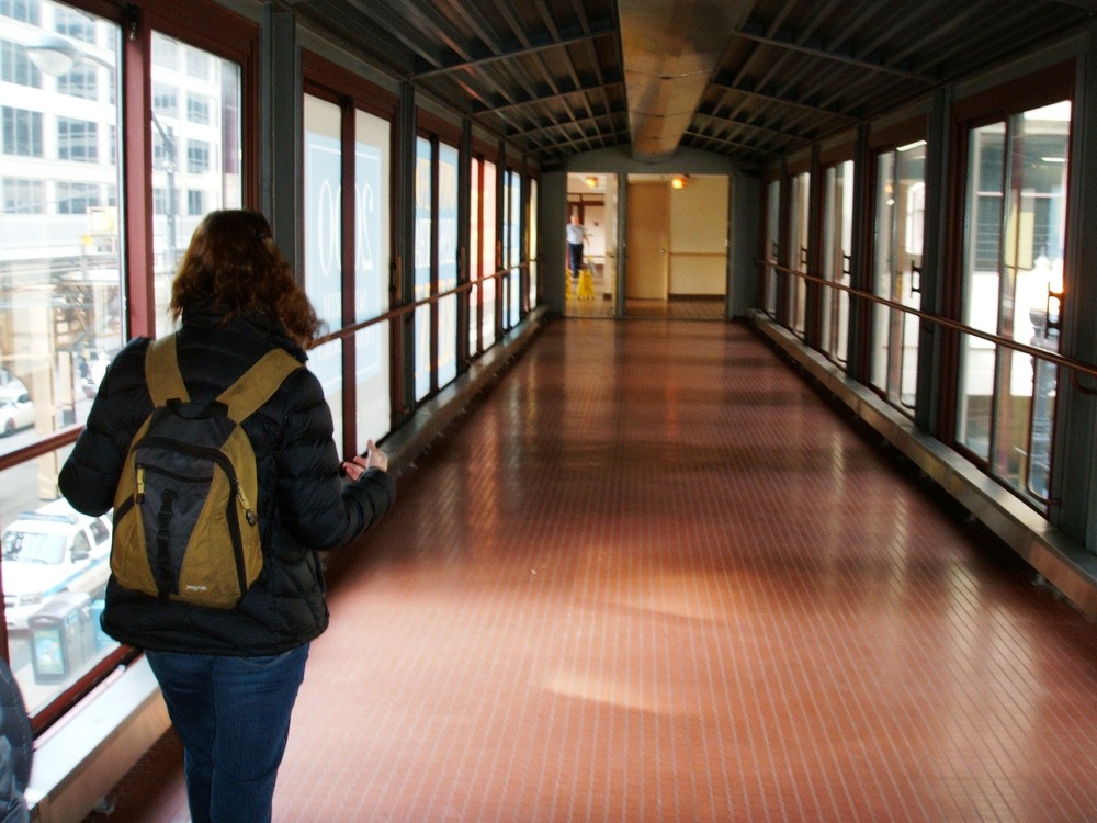 One_way_in_is_off_of_lakeThis_hotel_is_an_entry_pointI_walked_under_the_pedway_bridge_without_noticing_itView_from_bridgeRevolving_doors_moderate_windIndicatorsPedway_has_restaurants_and_l_stopsThese_are_at_the_start_and_end_of_each_section