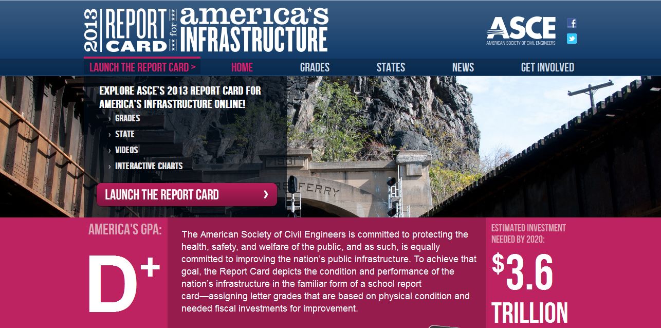 The American Society for Civil Engineering has created a nifty interactive website about the state of infrastructure in America at http://www.infrastructurereportcard.org/.