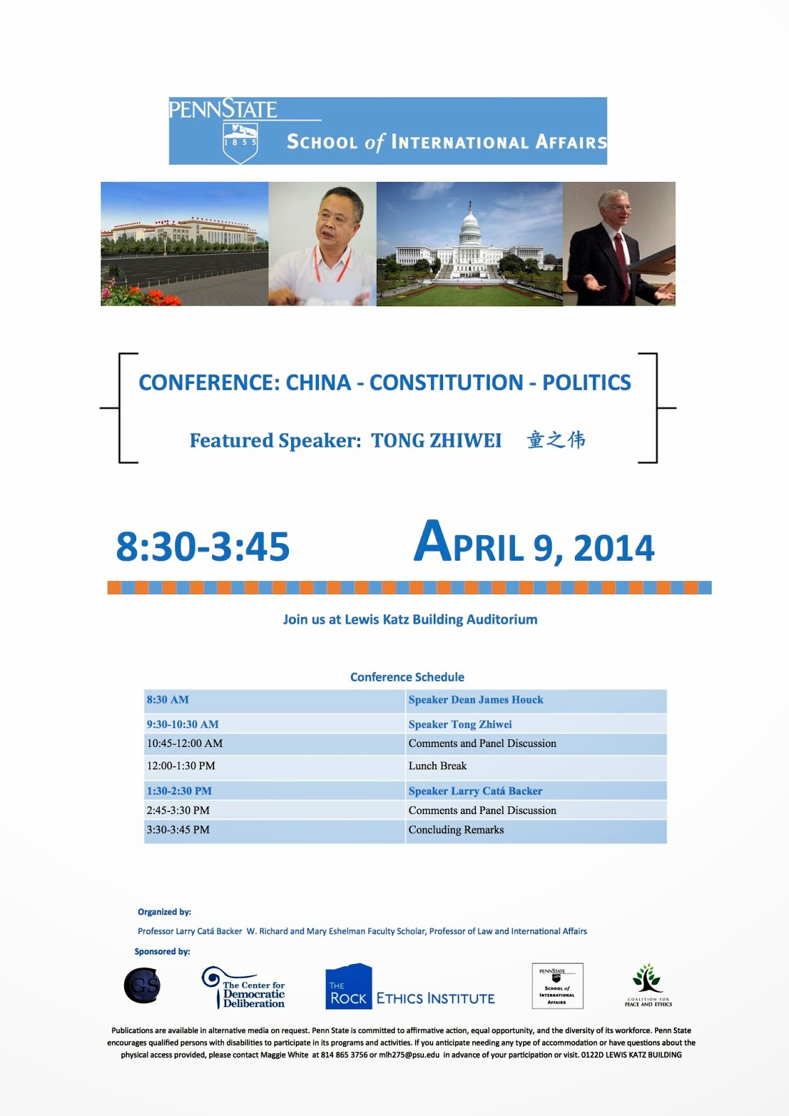 The video recording of the conference, China-Constitution-Politics, is now available for accessing via mediasite. I was involved in the PM discussion; I reviewed Dr. Larry Backer and graduate student Karen Wang‘s paper “THE EMERGING STRUCTURES OF SOCIALIST CONSTITUTIONALISM WITH CHINESE CHARACTERISTICS: EXTRA-JUDICIAL DETENTION (LAOJIAO AND SHUANGGUI) AND THE CHINESE CONSTITUTIONAL ORDER” which is soon coming out in Pacific Rim Law & Policy Journal; the AM session considered Zhiwei Tong (童之伟) and his new work “Two Issues.”