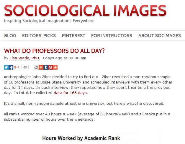 The answer is here; Anthropologist John Ziker studied “non-random sample of 16 professors at Boise State University and scheduled interviews with them every other day for 14 days. In each interview, they reported how they spent their time the previous day. In total, he collected data for 166 days.”