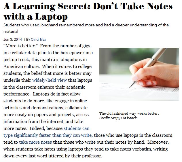 Obviously, as any educator will tell you, based on his/her experience, this is an imperfect explanation. Seeing this, the authors also conducted a content analysis, which shows that students writing longhand have to summarize in their own words and draw on conceptual mapping to digest the information.