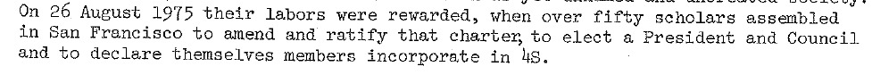 This newsletter contains information about the origins of the society. According to opening editorial, in connection with the Montreal Congress of the International Sociological Association (who knew?), the earliest foundations of the professional society were laid and an informal committee was established in 1974-75. On 26 August 1975, 50 members assembled in San Francisco to ratify a charter for 4S. Apparently, the 26th of August is 4S’s birthday!