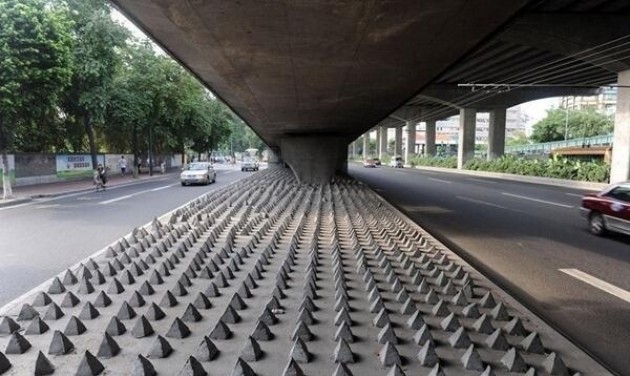 What’s the point? Those spikes are about keeping homeless people from laying down or loitering (above, an imagine from China), although many readers might be more familiar with the anti-skate boarding elements of our urban landscape, like these below (the most supremely dick-ish one I could find):